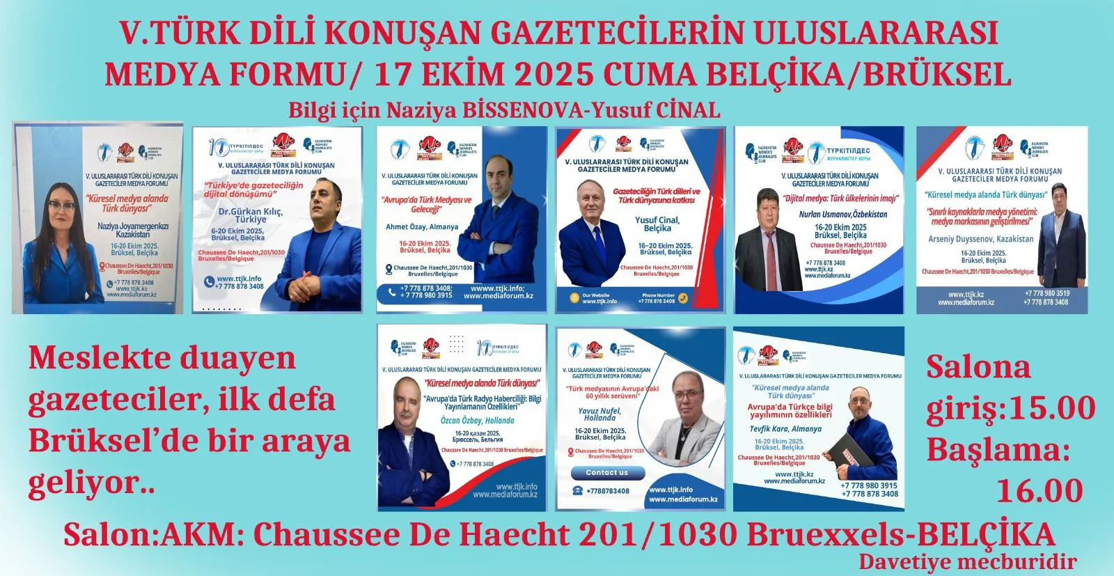 2025 жылдың 16-20 қазаны аралығында «Түркітілдес журналистер қоры» мен Қазақстандағы Әйел журналистер клубы мен Бельгияның Inter Media Bruxselles Asbl қоғамдық қоры Брюссель қаласында «Жаһандық медиа кеңістіктегі түркі әлемі» тақырыбына V Халықаралық түркітілдес журналистер медиа форумын ұйымдастырады. Медиа форумға Қазақстан, Еуропа елдері, Түркия, Орталық Азияның БАҚ басшылары, журналистер, ақпарат және туризм саласына қатысты мемлекеттік органдар, депутаттар PR менеджерлер, медиа саласындағы үкіметтік емес ұйым өкілдері, туризм саласының мамандары, ЖОО журналистика факультеттерінің декандары мен студенттері, Қоғам қайраткерлері қатысады,-деп хабарлайды abaidan.kz ақпаратық агенттігі ttjk.kz сілтеме жасап.