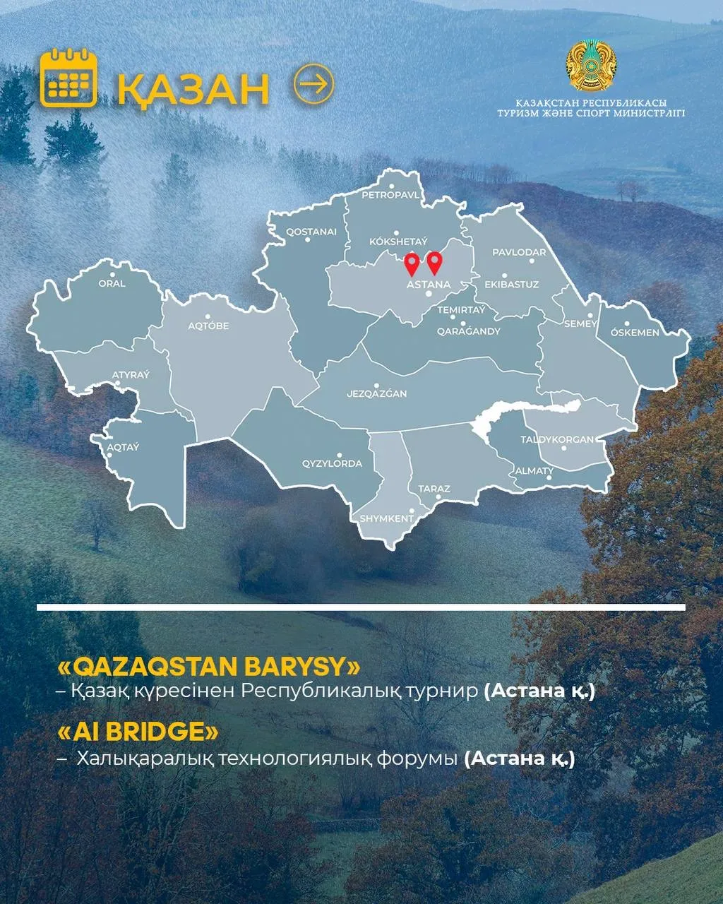 2026 жылға арналған күнтізбе – Мемлекет басшысының 2025 жылғы 14 наурызда Бурабайда өткен Ұлттық құрылтай отырысында берген тапсырмаларын іске асыру аясындағы қадамдардың бірі. Бұл бастама оқиғалы туризмді жүйелі дамытуға, өңірлердің туристік бірегейлігін нығайтуға, қолайлы цифрлық шешімдер қалыптастыруға және Қазақстан бойынша саяхаттардың тартымдылығын арттыруға бағытталған.