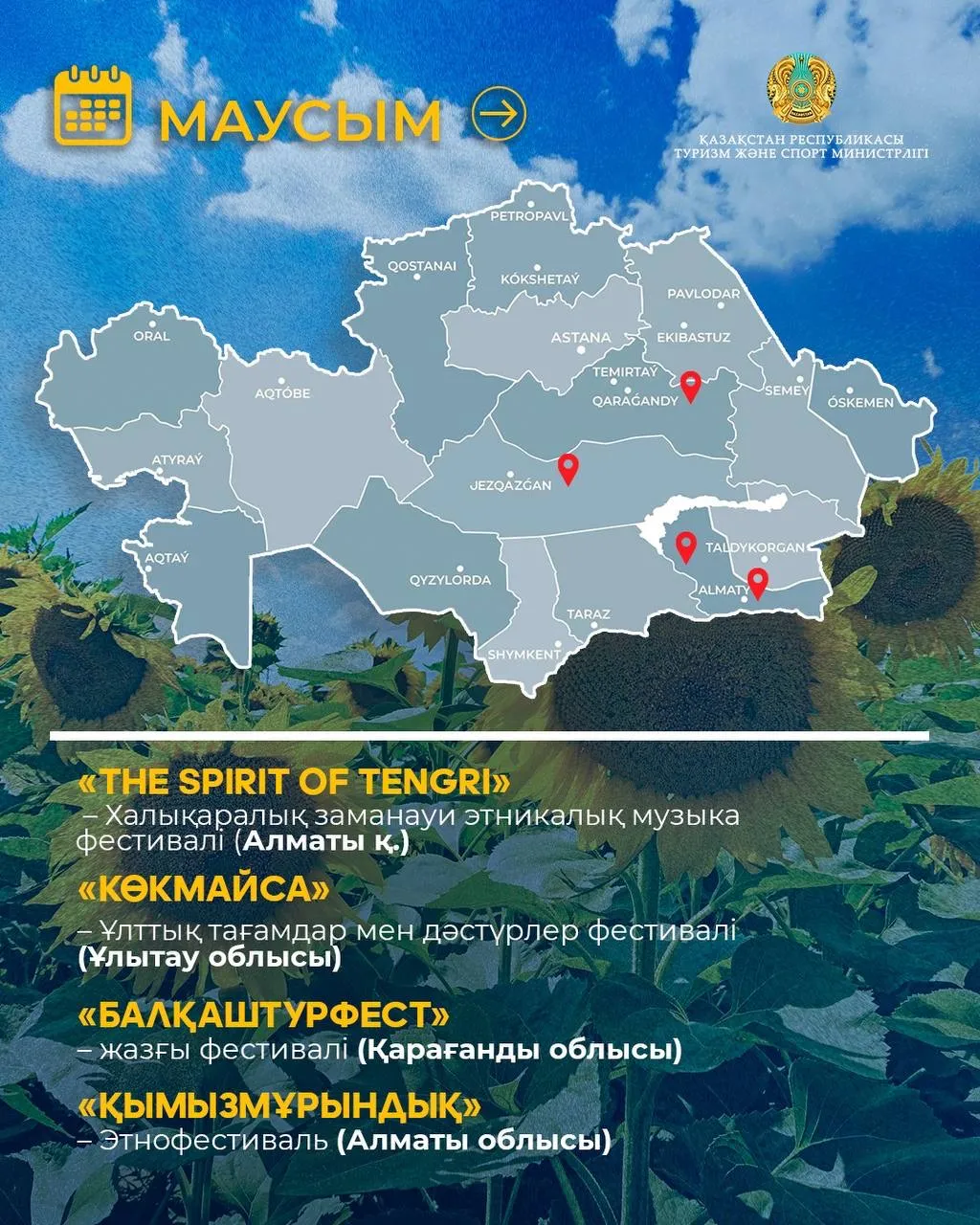 Туризм және спорт министрлігі 2026 жылға арналған мәдени-туристік оқиғалар күнтізбесін дайындады. Құжатта еліміздің 20 өңірінде өтетін 55 ірі іс-шара қамтылған.