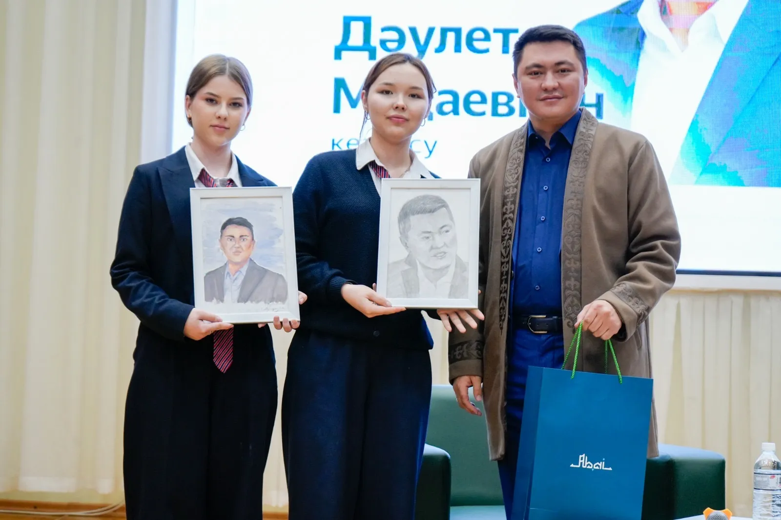 Во время встречи два учащихся начали рисовать портрет Дәулета Мукаева прямо в актовом зале и завершили его к окончанию мероприятия, после чего преподнесли работу гостю в подарок