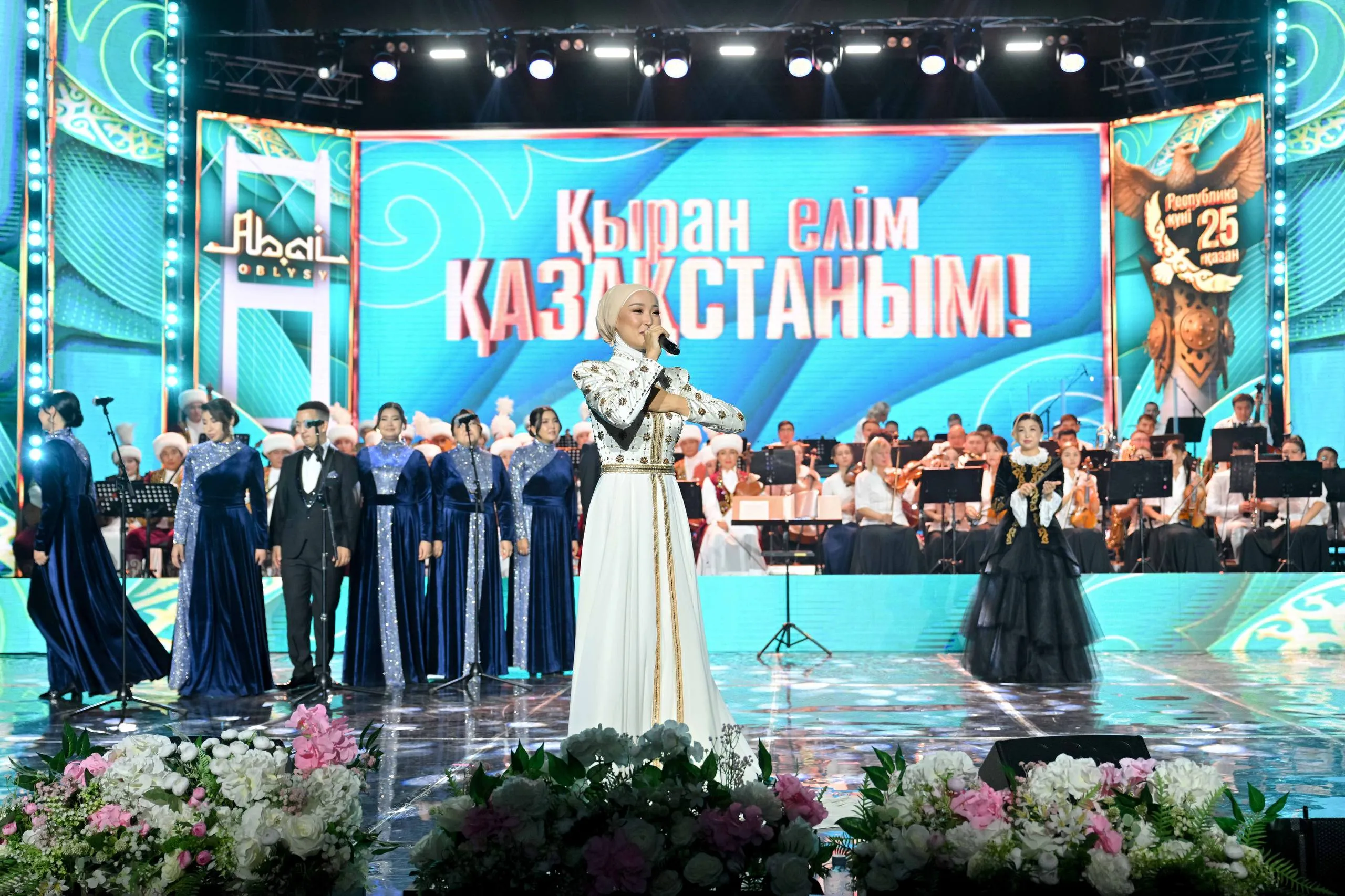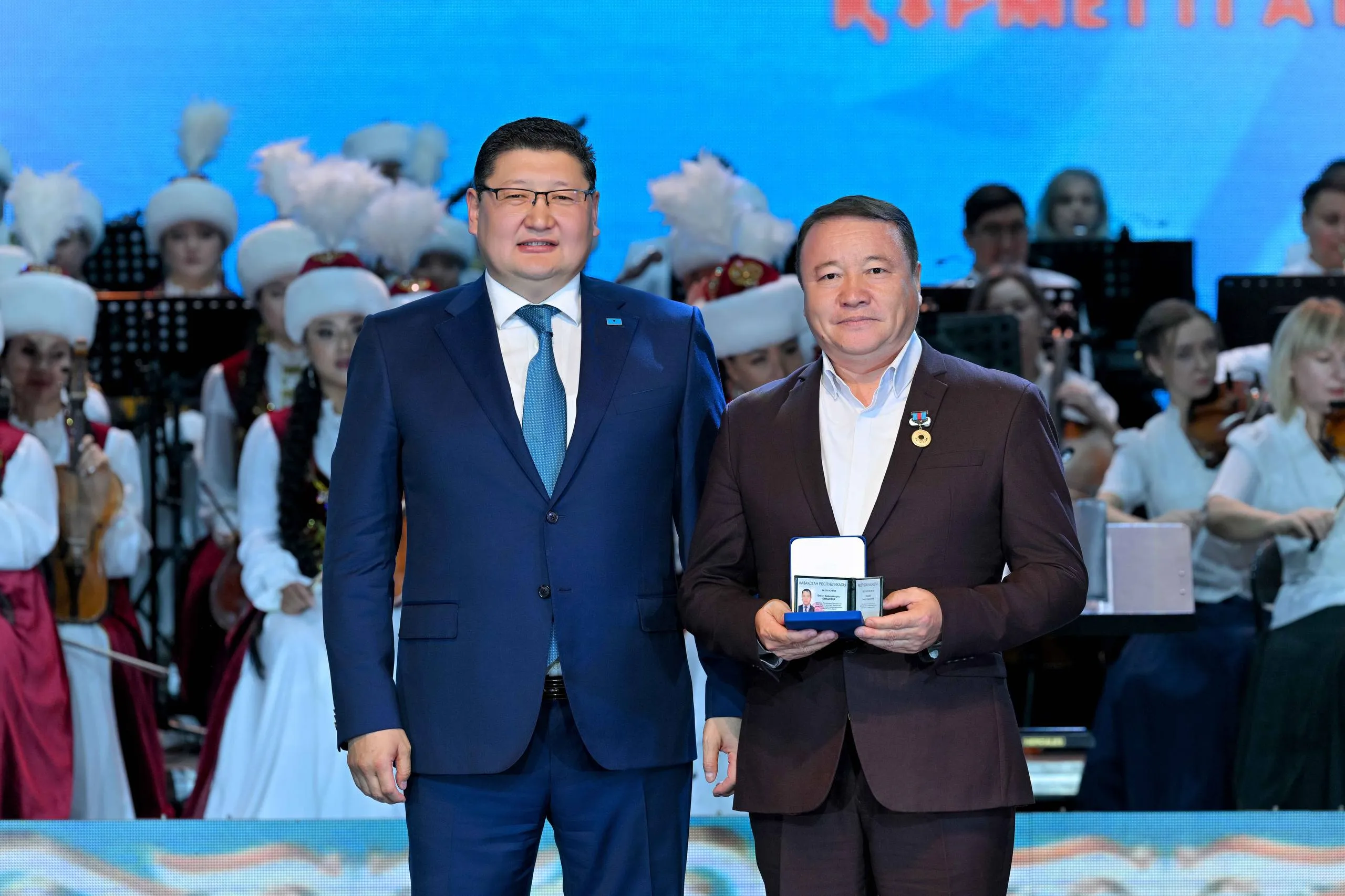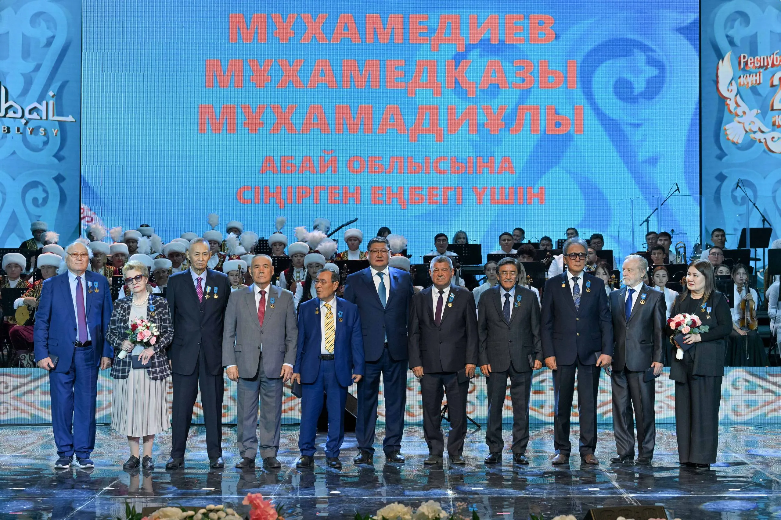 Торжественное собрание завершилось праздничным концертом. Для зрителей выступили заслуженный деятель Казахстана Досымжан Танатаров, Зарина Омарова, Молдир Ауелбекова, солист квартета «Жігіттер» Мырзахан Маканов, артисты областной филармонии, студенческий хор музыкального училища им. М.Тулебаева и эстрадно-симфонический оркестр акима области Абай.