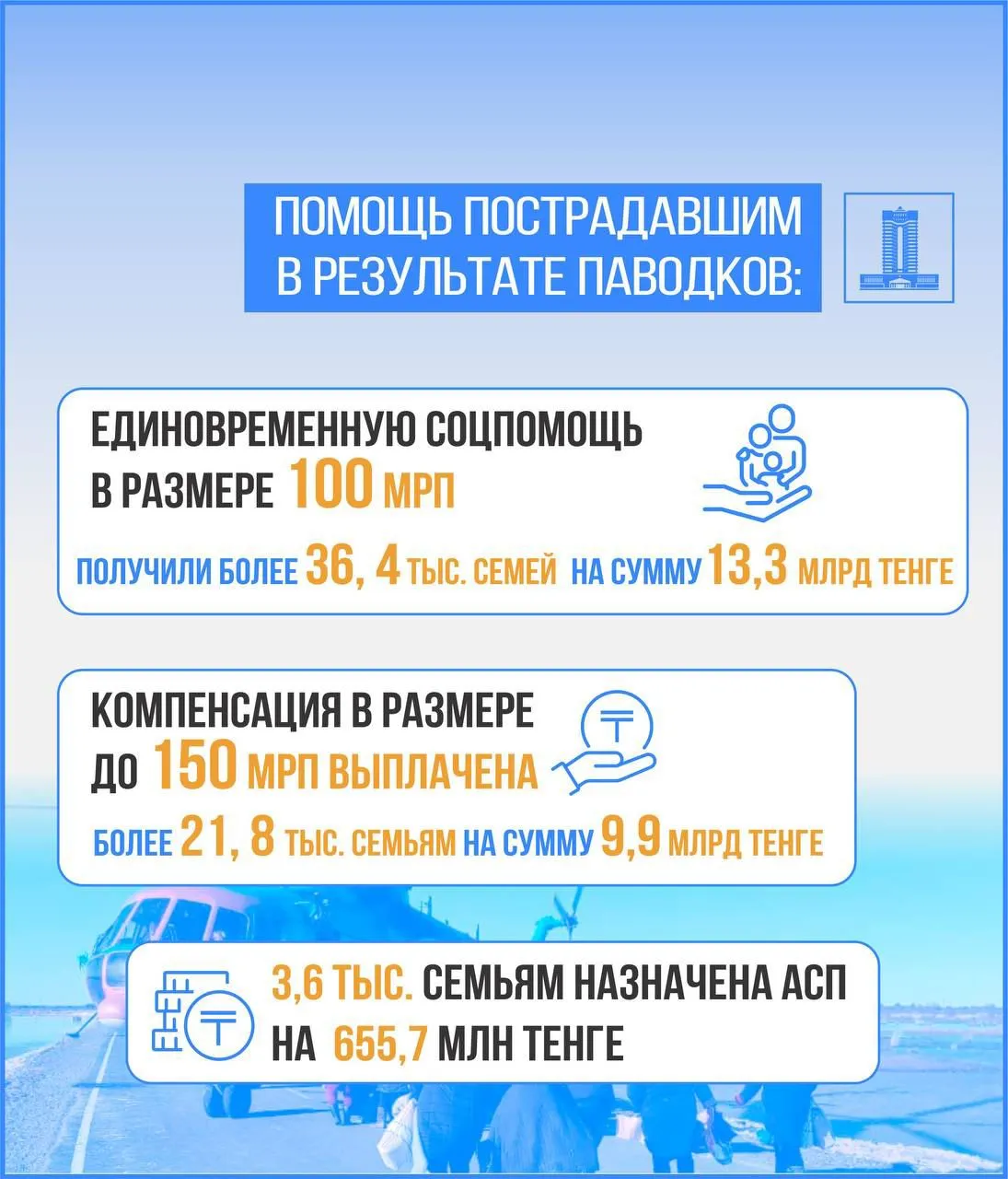 Единовременная соцпомощь в размере 100 МРП предоставлена более 36, 4 тыс. семьям, пострадавшим от паводков в 2024 году